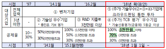 * 기존에는 투자 시점에서 피투자 기업이 업력 3년 이내의 기술성 우수, 벤처기업 등 자격 요건을 충족해야만 투자자가 소득공제를 신청할 수 있음