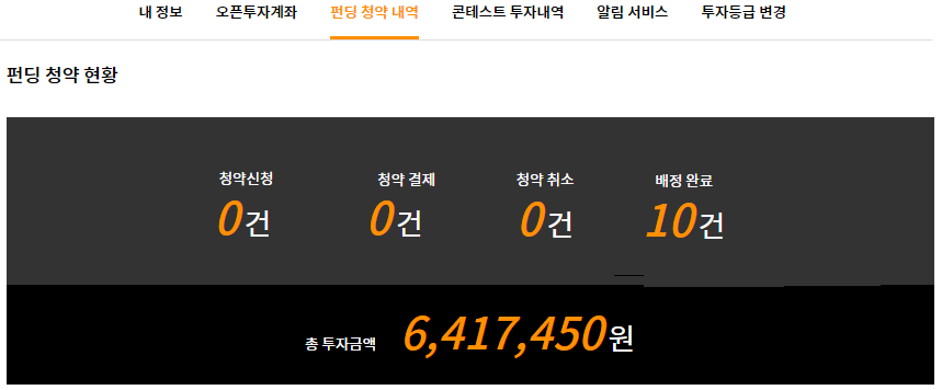 투자자는 "펀딩 청약내역" 메뉴를 통해 오픈트레이드에서 청약한 모든 거래를 확인할 수 있습니다.