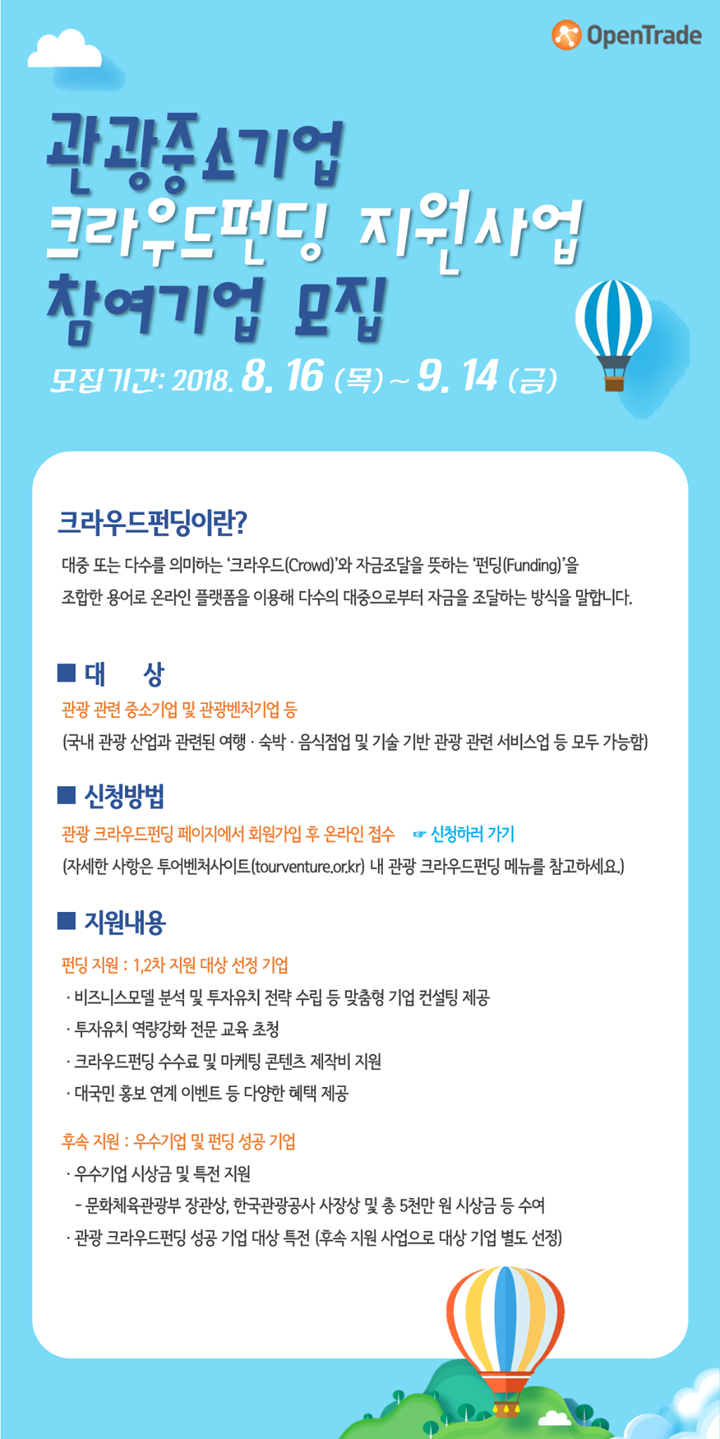 스타트업 지원 프로그램 [오픈트레이드 X 한국관광공사] 관광중소기업 크라우드펀딩 지원사업 참여기업 모집!!