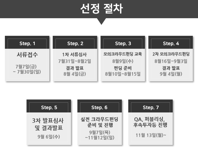 ㅇ 지원 규모 : 실전 크라우드펀딩(최대 7억원) 및 후속 투자유치, QA, 마케팅, 퍼블리싱 연계 지원(최종 선발 수는 미정)