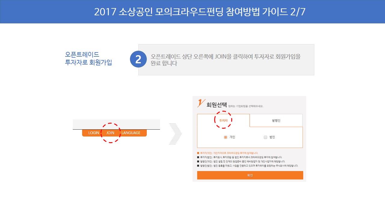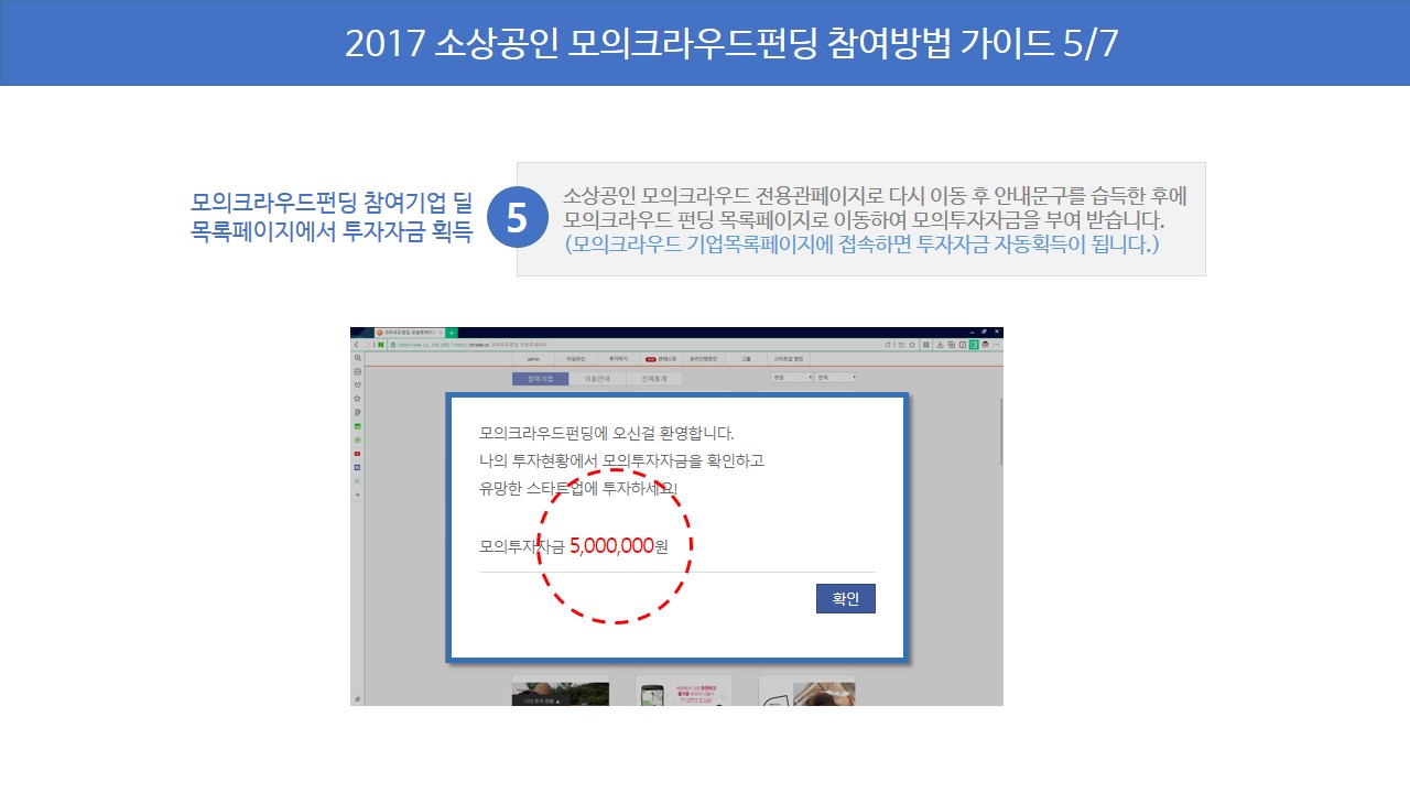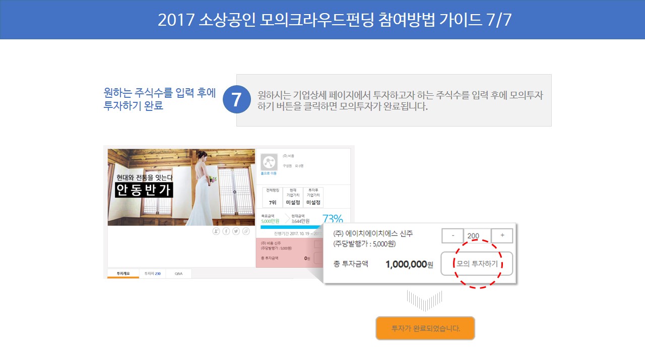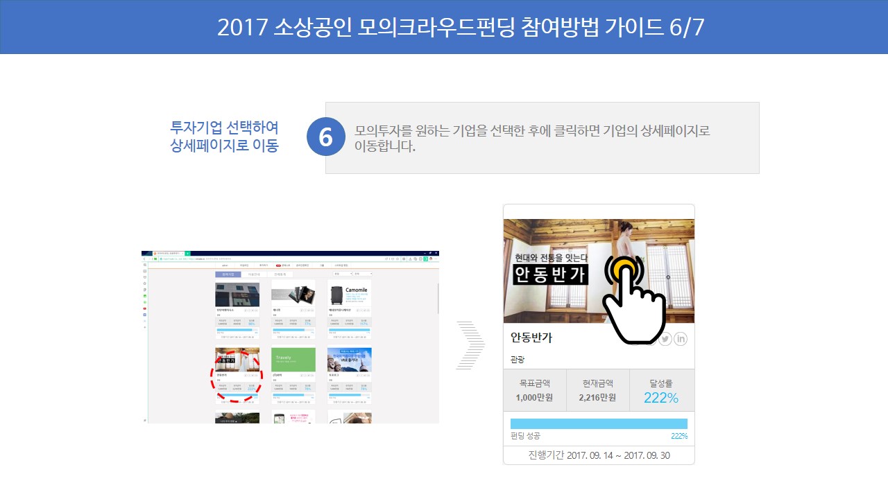 [스타트업 지원 프로그램] 2017 소상공인 모의 크라우드펀딩 참여방법 안내 2017-10-27 16:51:31 2017 소상공인 모의 크라우드펀딩 참여방법 안내2017 소상공인 모의 크라우드펀딩 참여방법을 안내해드립니다.모의 투자에 참여해 주셔서 우리 700만 소상공인들에게 활력의 응원을 전달해주세요 ! 총상금 1500만원을 걸고 FOOD TECH 분야의 잡스를 찾는다고? 제1회 오픈 게임 크라우드 투자대회 공고 목록