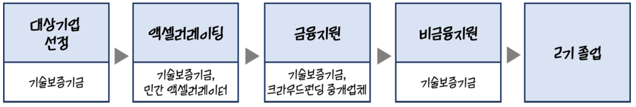 ③ 내 용 : 4차 산업혁명에 특화 · 전문화된 스타트업 육성 프로그램으로 ‘대상기업 발굴 → 액셀러레이팅 → 금융 · 비금융 서비스 지원’을 통해 스타트업이 성공창업에 이르기까지 체계적으로 지원