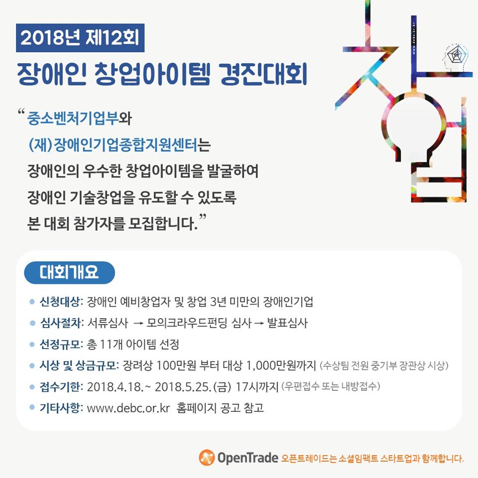 [스타트업 지원 프로그램] 장애인 창업아이템 경진대회 참가기업 모집 2018-05-15 10:12:32 중소벤처기업부와 (재)장애인기업종합지원센터에서 개최하는 <2018년 제12회 장애인 창업아이템 경진대회>에 오픈트레이드가 함께합니다. 총 11팀 시상, 장려상 상금 100만원 부터 대상 상금 1,000만원 까지! 최종 선정자 전원 중소벤처기업부 장관상 시상!우수 창업 아이템 및 유망 아이디어를 보유하고 계신 장애인 (예비) 창업자는 자세한 사업 공고를 확인하세요!사업 공고 확인하기 4대강 다큐영화 상영관 확보를 위한 크라우드펀딩 오픈트레이드-오베이자이언트展 국내 최초 전시 크라우드 펀딩 성공 목록