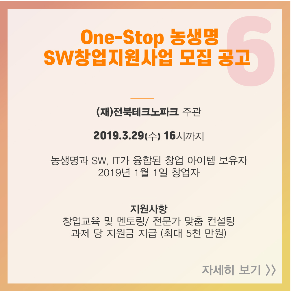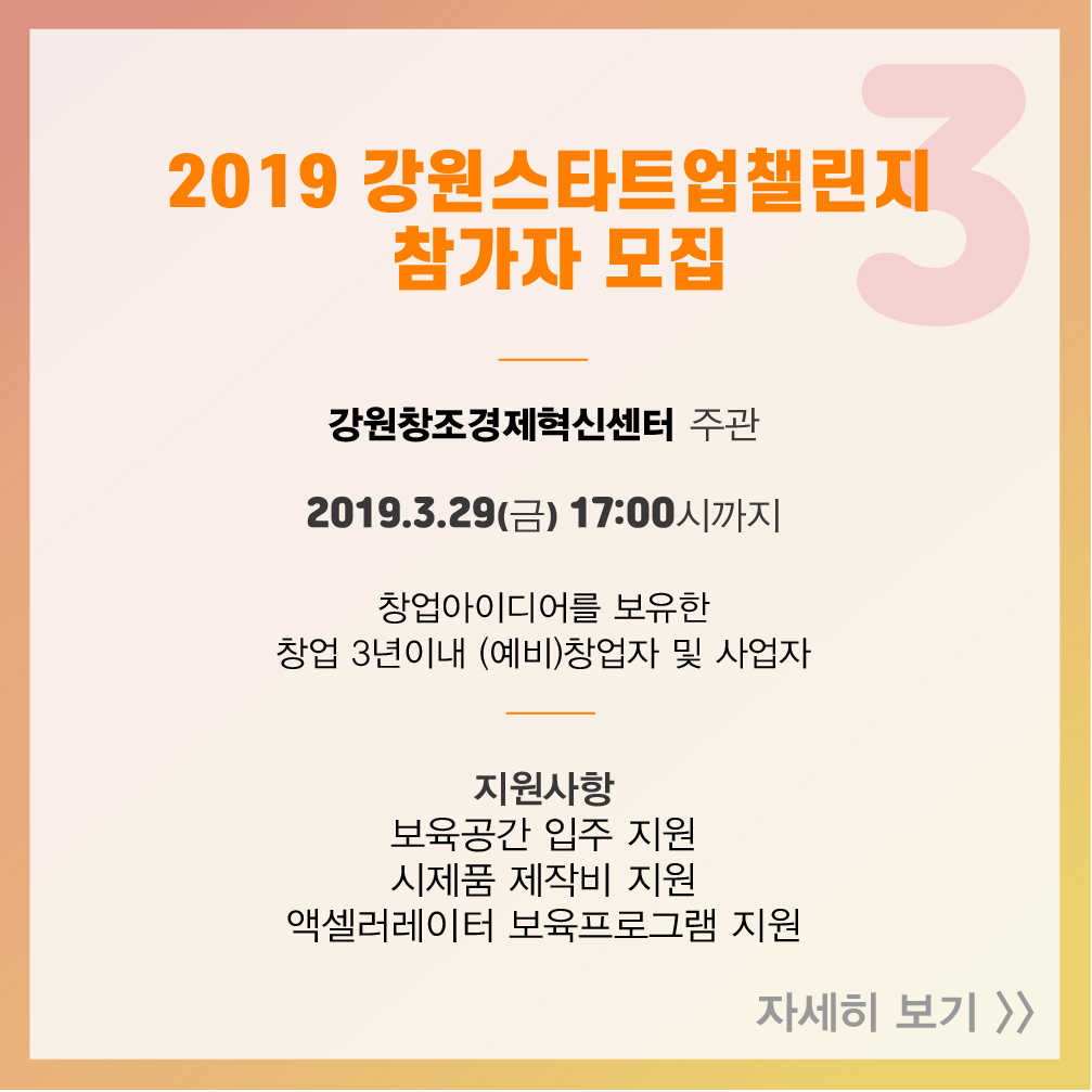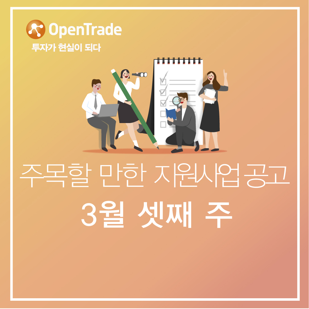 [스타트업 지원 프로그램] 2019년 3월 셋째 주, 창업지원사업공고 2019-03-19 14:50:11 오픈트레이드, 광주창조경제혁신센터와 MOU 체결 2019년 3월 둘째 주, 창업지원사업공고 목록