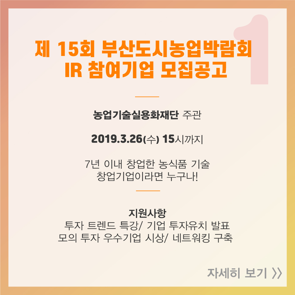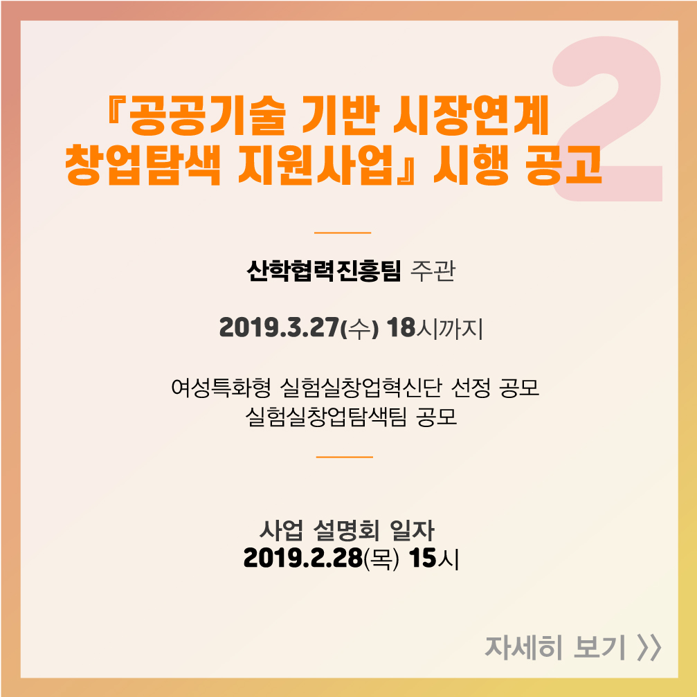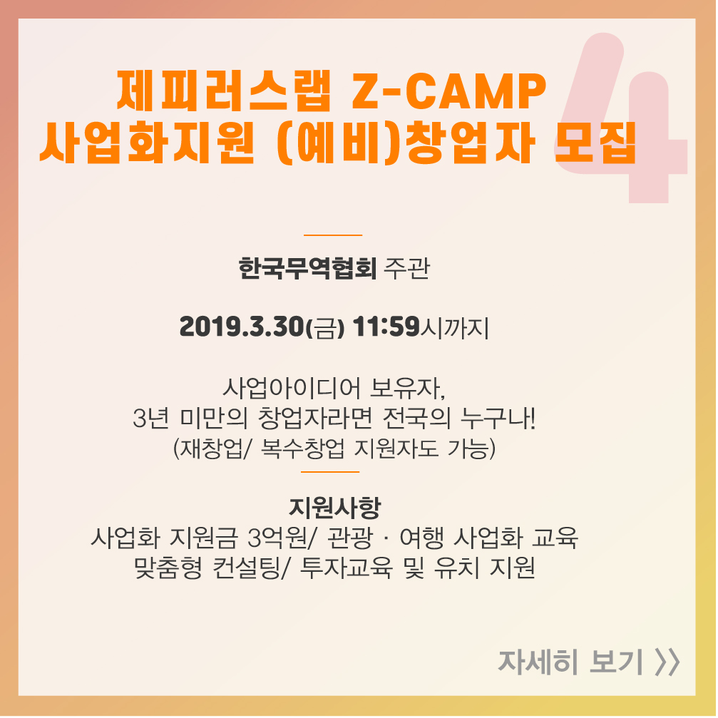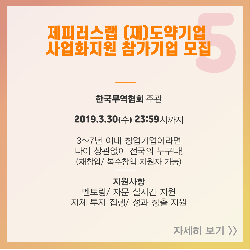 [스타트업 지원 프로그램] 2019년 3월 셋째 주, 창업지원사업공고 2019-03-19 14:50:11 오픈트레이드, 광주창조경제혁신센터와 MOU 체결 2019년 3월 둘째 주, 창업지원사업공고 목록