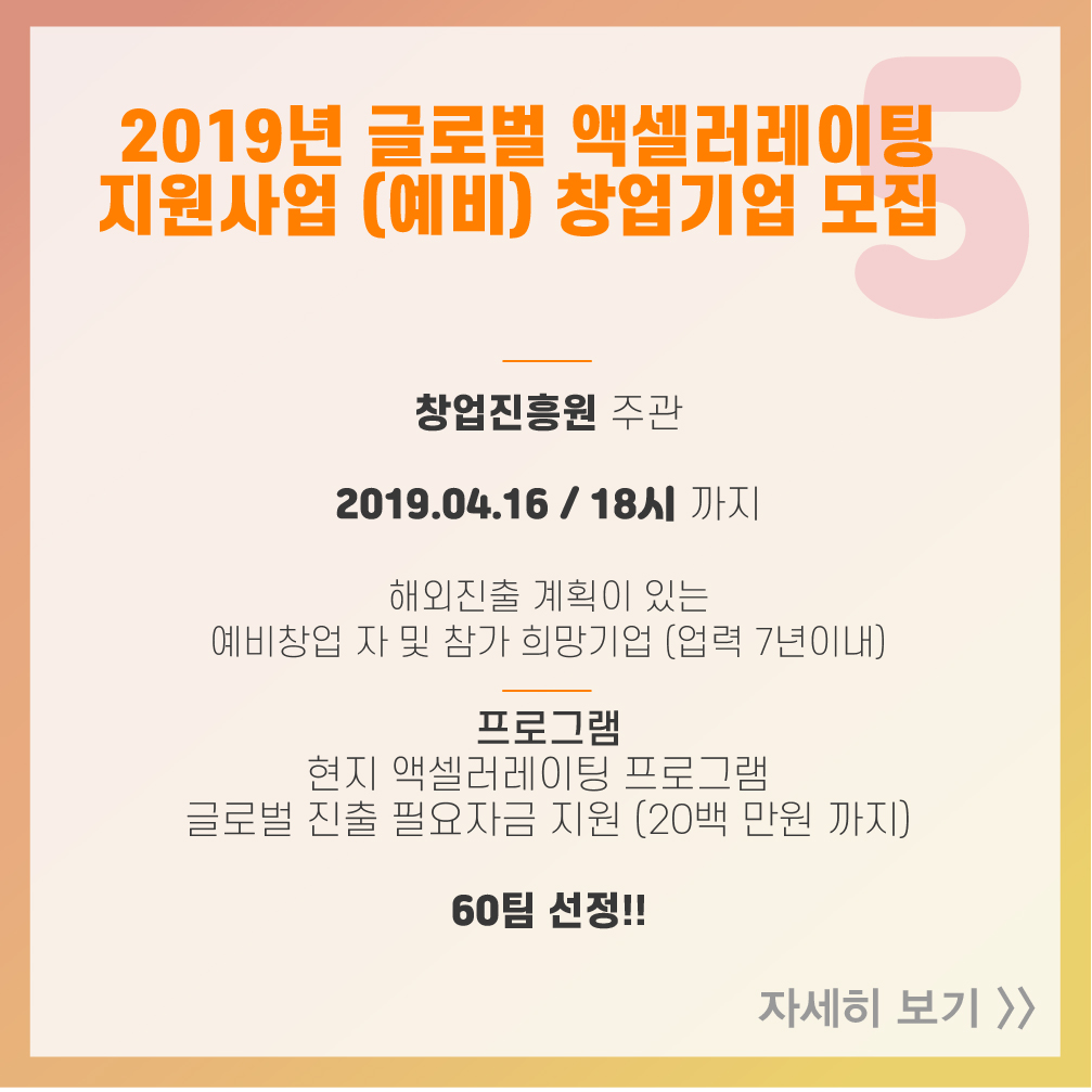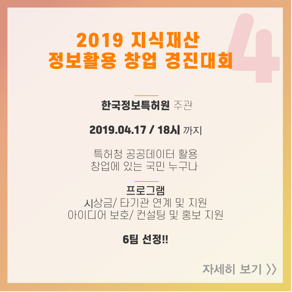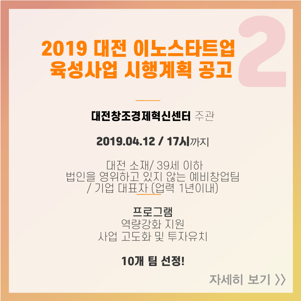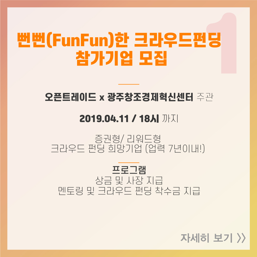 [스타트업 지원 프로그램] 2019년 4월 첫째 주, 주목해야 할 사업지원공고! 2019-04-02 10:05:27 2019년 4월 첫째 주 주목해야 할 사업지원 공고 2019년 4월 둘째 주, 주목해야 할 사업지원공고! [광주창조경제혁신센터 X 오픈트레이드] 뻔뻔한 크라우드펀딩 참가기업 모집 목록