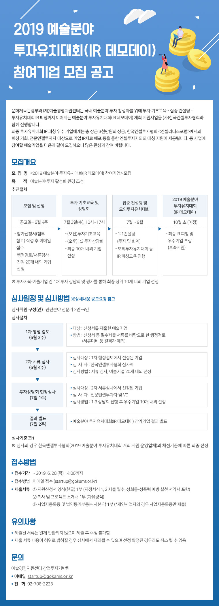 [스타트업 지원 프로그램] 2019 예술분야 투자유치대회(IR 데모데이) 참여기업 모집 공고 2019-06-10 10:21:28 붙임1. 2019 예술분야 투자유치대회(IR데모데이) 참여기업 신청서.hwp93KB붙임2. 2019 예술분야 투자유치대회(IR데모데이) 참여기업 모집요강 공고문.pdf254KB 모바일 주문 앱 ´패스오더´ 개발 사 (주)페이타랩, 메가커피와 계약체결 주식과 채권, 무엇이 어떻게 다를까? 목록