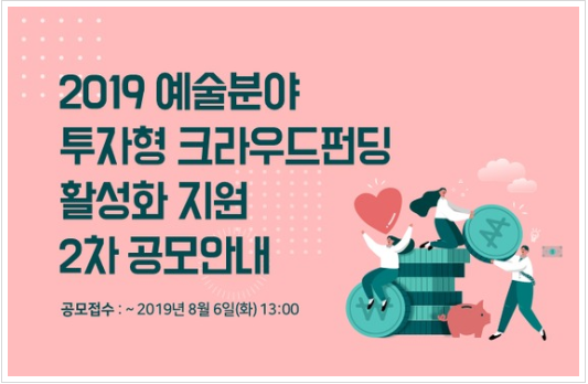 2019 예술분야 투자형 크라우드펀딩 활성화 지원사업에 참여를 희망하는 기업은 오는 8월6일까지 신청이 가능하며 관련한 자세한 내용은 (재)예술경영지원센터 공지사항에서 확인할 수 있다.